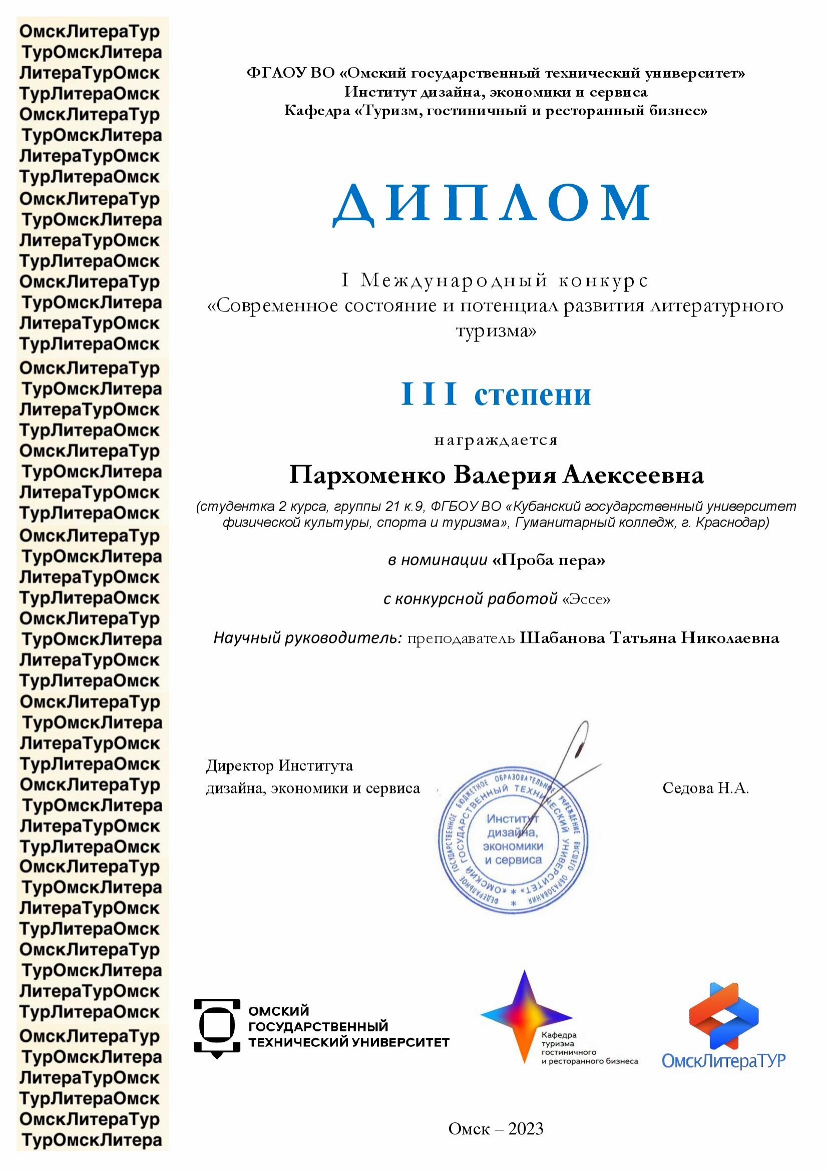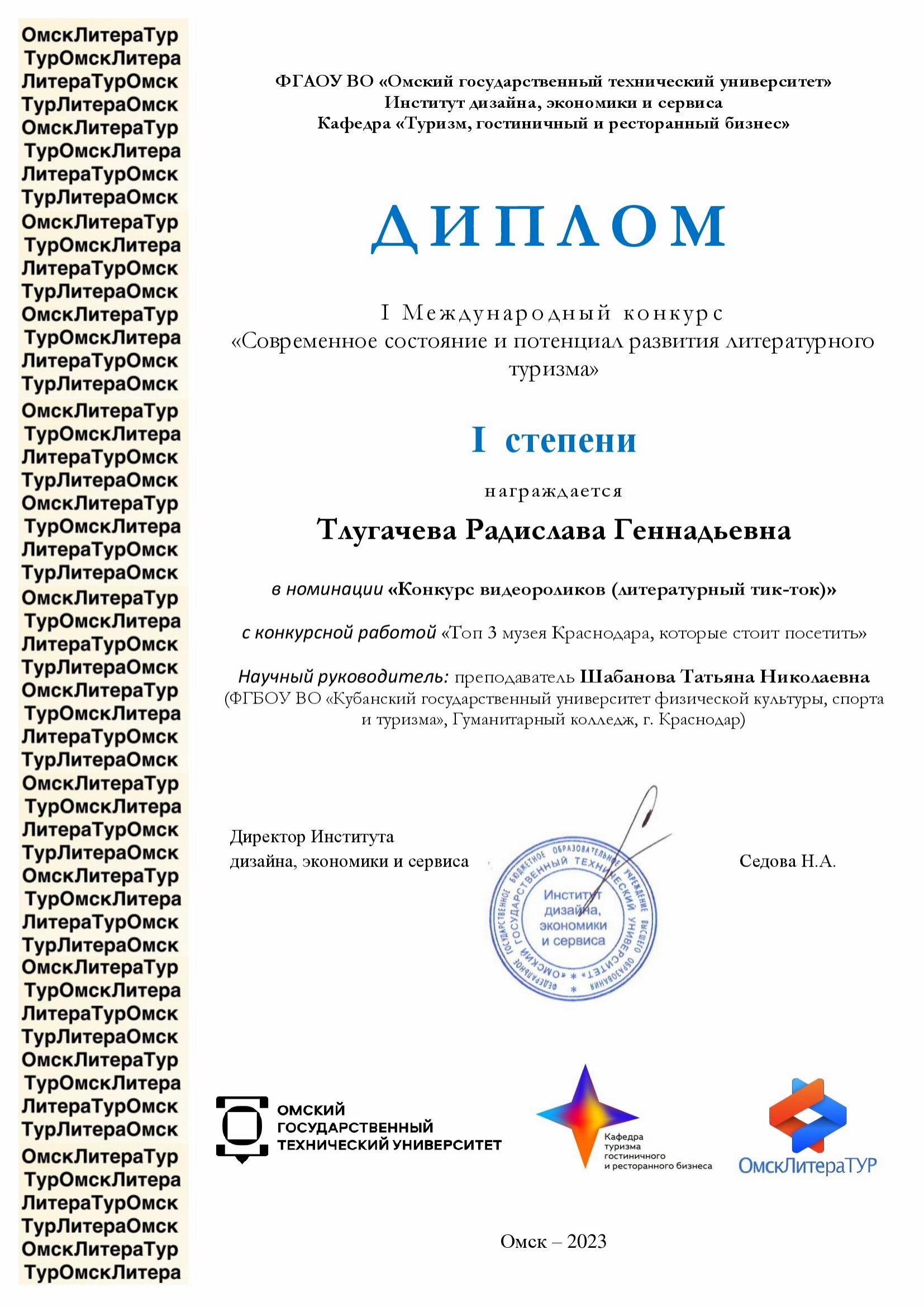 На базе Омского государственного технического университета с 28 февраля по 5 апреля 2023 проводился международный конкурс научных инновационных проектов «Современное состояние и потенциал развития литературного туризма», организованный кафедрой туризма, гостиничного и ресторанного бизнеса.