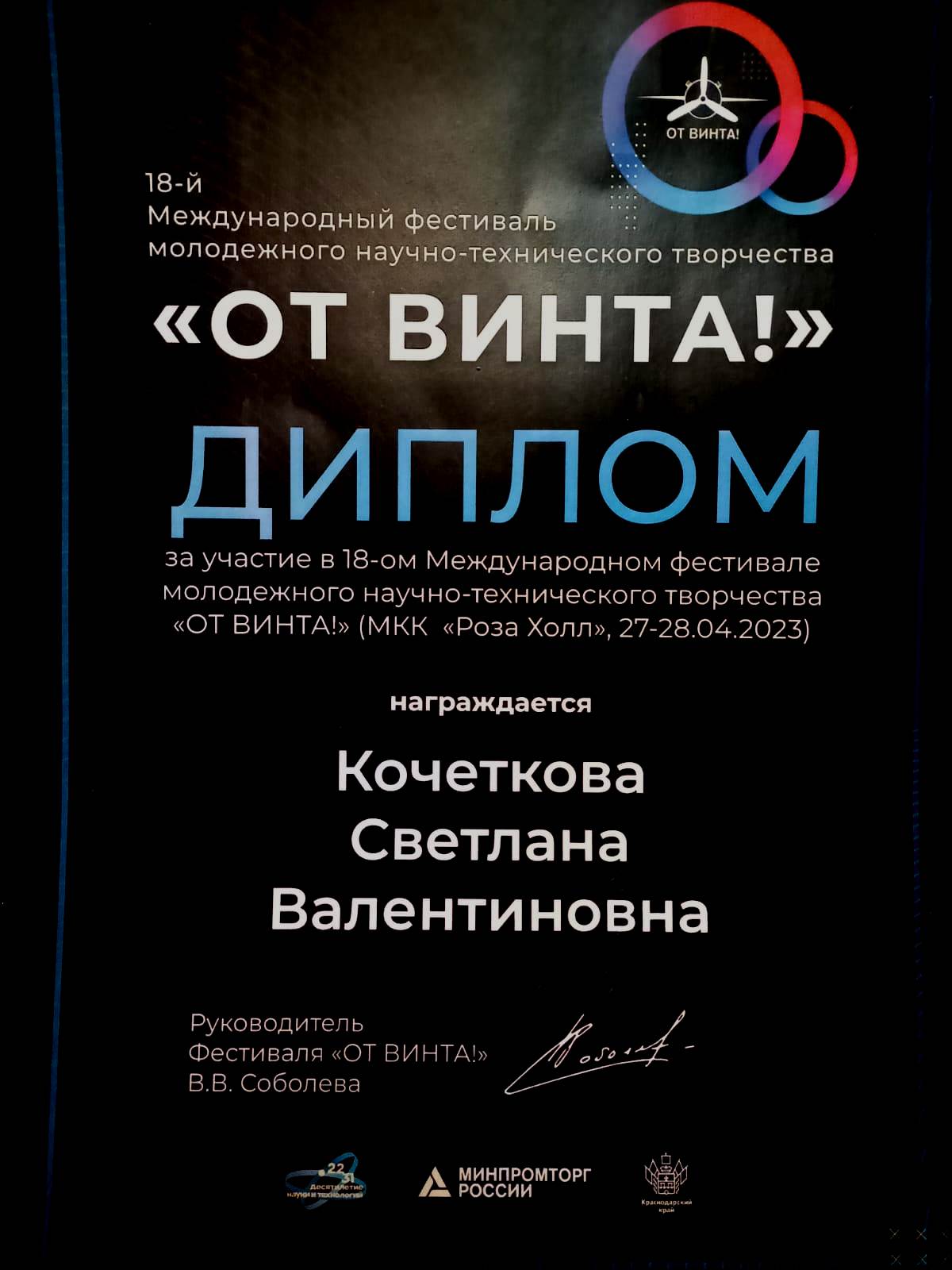 С 26 по 29 апреля 2023 года в горном кластере Роза Хутор Краснодарского края прошел XVIII Международный фестиваль молодежного научно-технического творчества «От Винта!». Фестиваль входит в список официальных мероприятий Десятилетия науки и технологий в России и проходит под эгидой Минпромторга РФ. В Краснодарском крае он проводился в третий раз. В 2023 году в нем приняли участие представители 80 регионов и более чем 30 зарубежных стран.