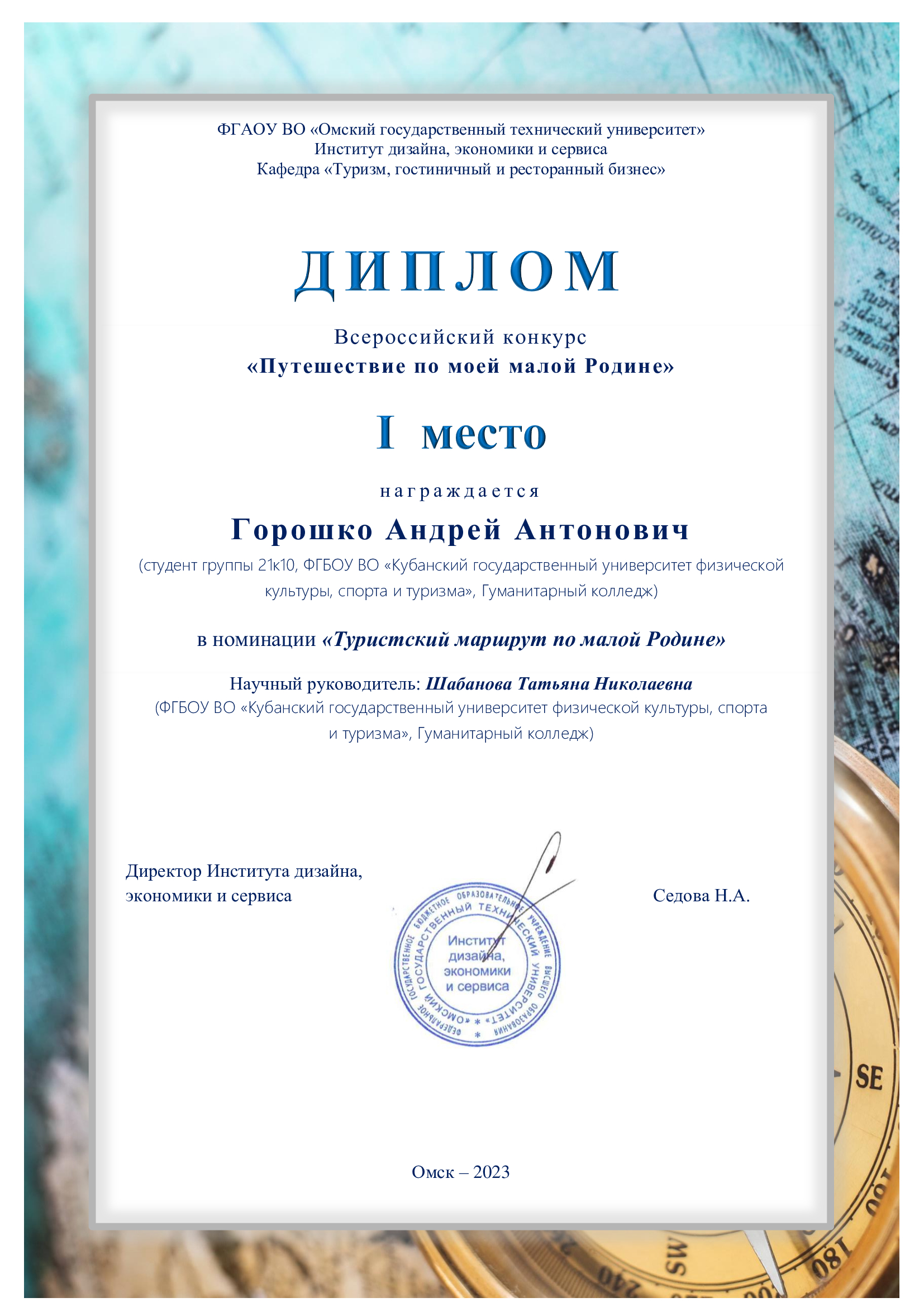 Андрей Горошко– I место в номинации «Туристский маршрут по малой Родине».