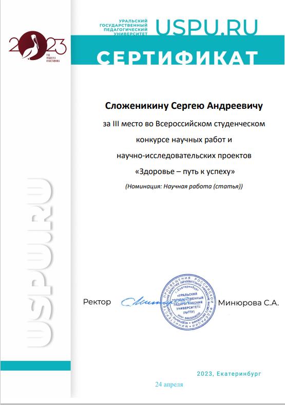 С 13 января по 24 апреля 2023 года на базе кафедры анатомии, физиологии и безопасности жизнедеятельности Института естествознания физической культуры и туризма Уральского государственного педагогического университета прошел Всероссийский конкурс научных работ и научно-исследовательских проектов студентов по здоровьесбережению в образовательной среде «Здоровье – путь к успеху». Конкурс проводился с целью стимулирования и поддержки научно-исследовательской, практически значимой, творческой деятельности студентов в области здоровьесбережения в образовательной среде.