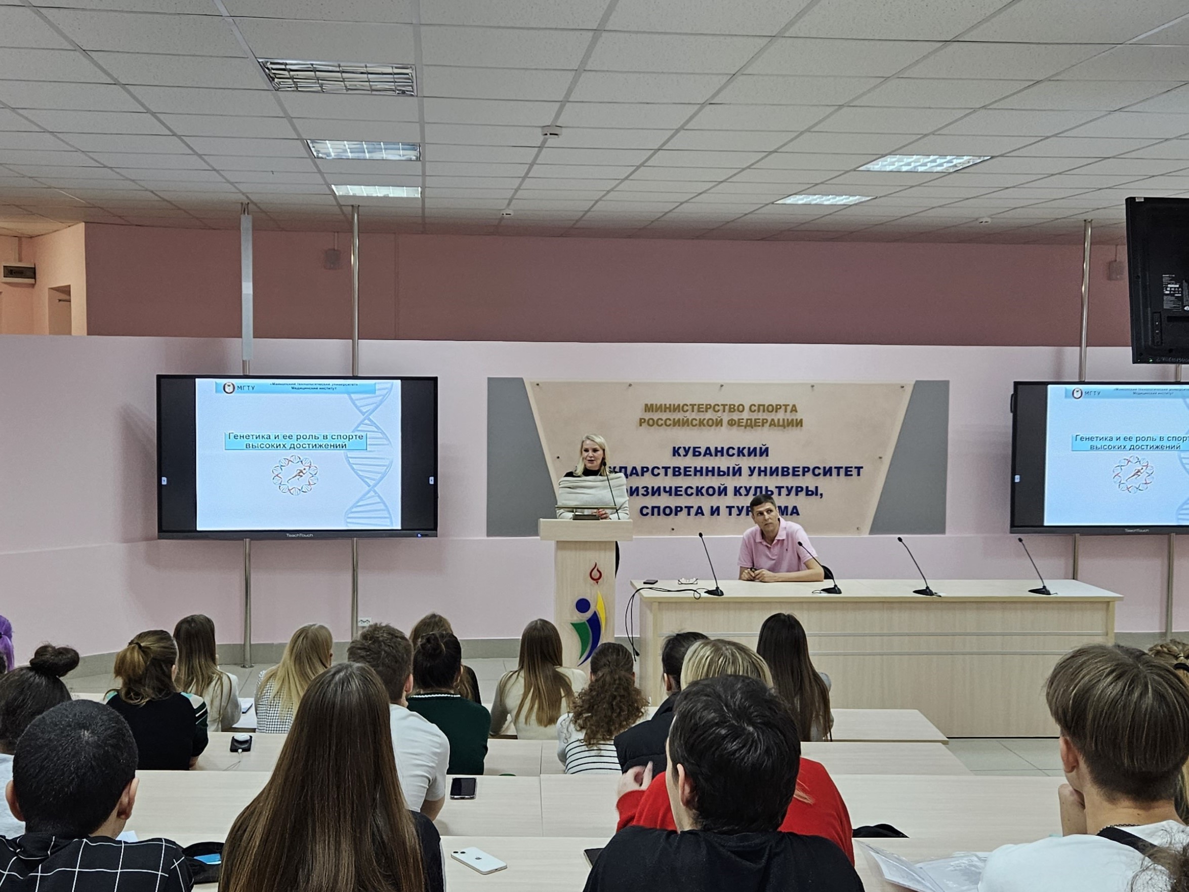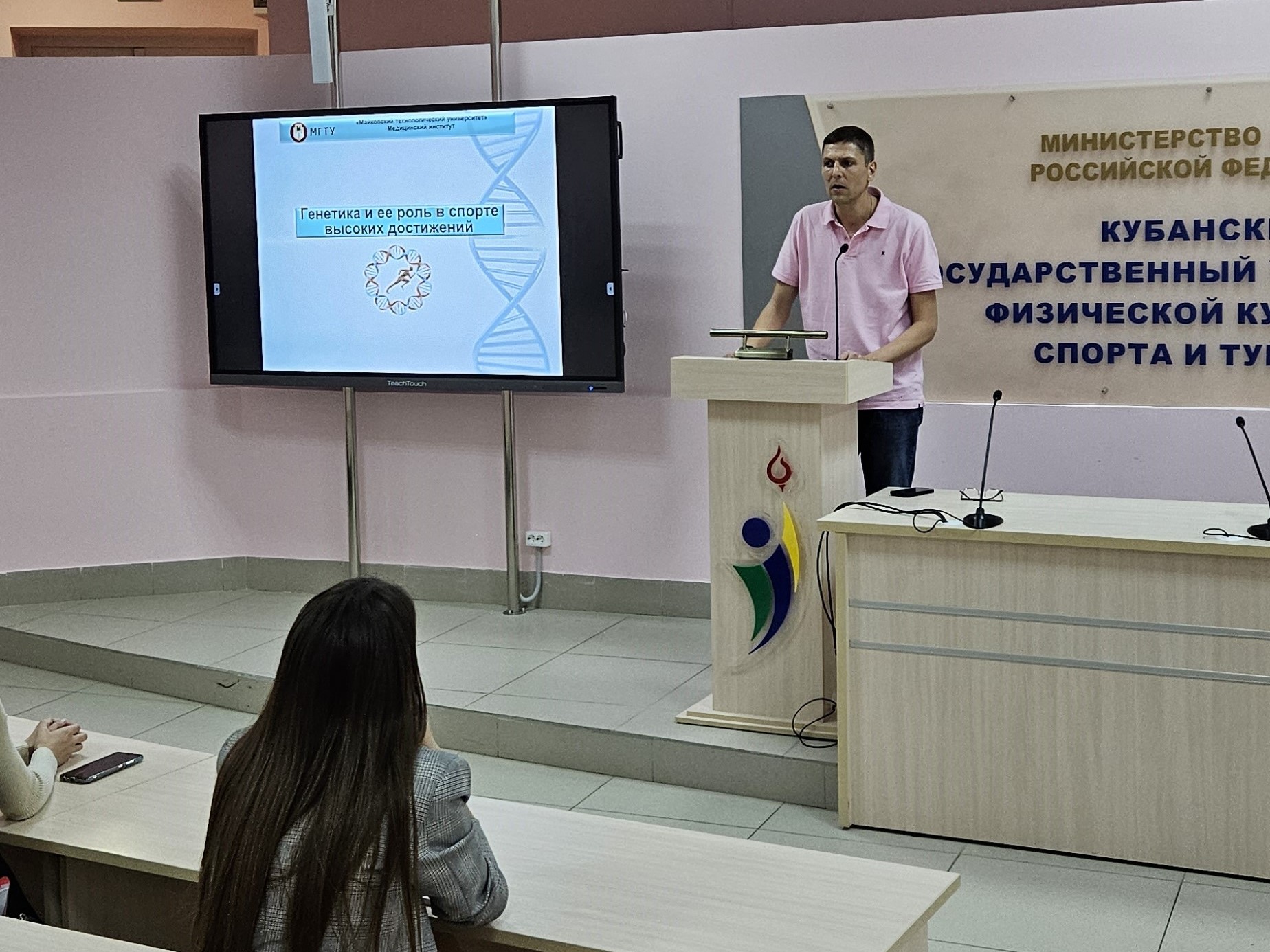 27 октября на кафедре анатомии и спортивной медицины университета в рамках недели кафедры состоялась открытая научно-популярная лекция «Генетика и ее роль в спорте высоких достижений» для студентов и преподавателей КГУФКСТ. Лекцию провел Дмитрий Витальевич Муженя – кандидат биологических наук, доцент кафедры физиологии Майкопского государственного технологического университета.