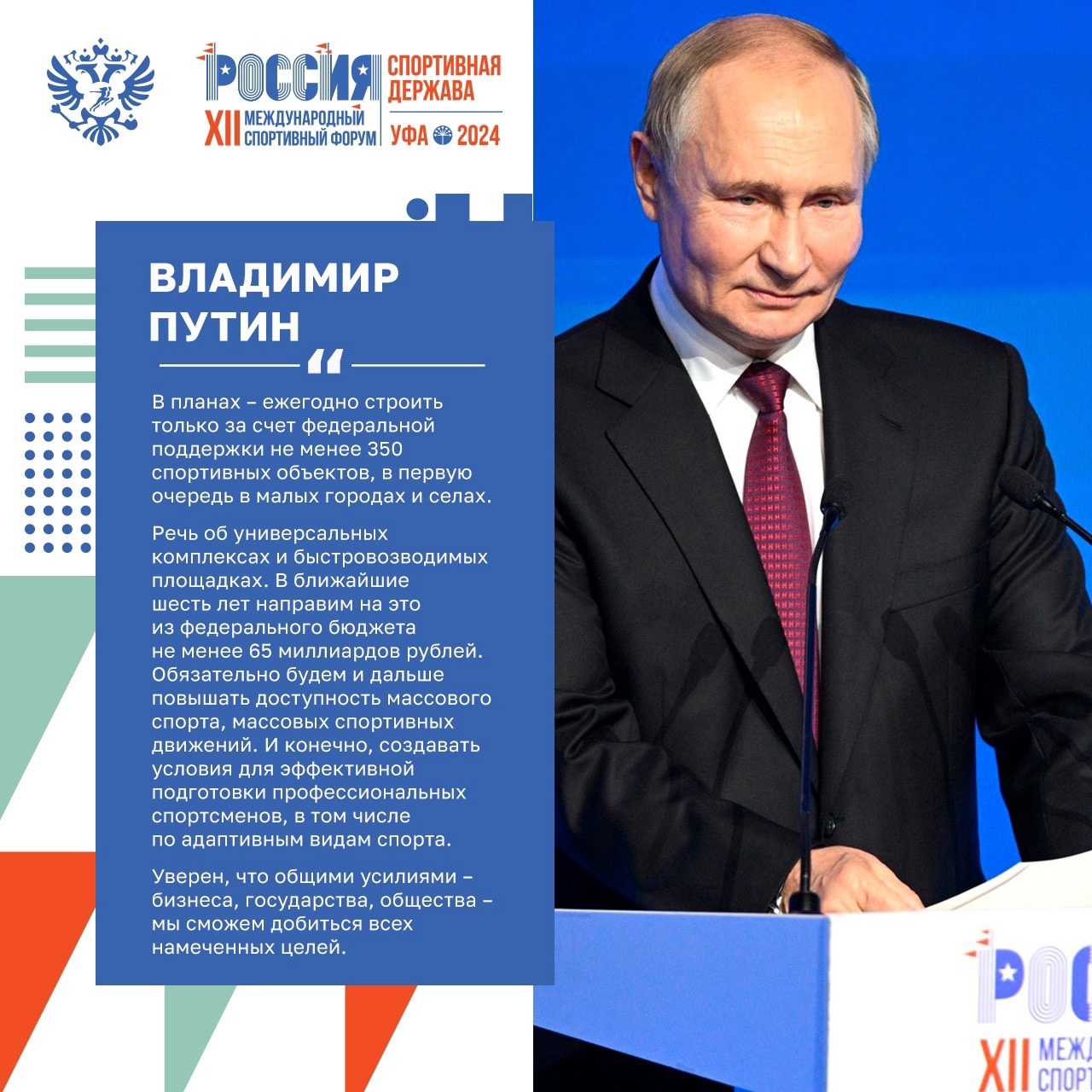 «Мы в России видим в спорте один из ключевых путей к достижению национальных целей развития, мощный ресурс, способный повысить качество жизни людей, открыть им новые горизонты самореализации, поверить в себя и стать успешным – и в спорте, и в жизни в целом. В числе наших основных приоритетов – формирование максимально широких возможностей для занятий физкультурой и спортом.» - отметил Владимир Владимирович.