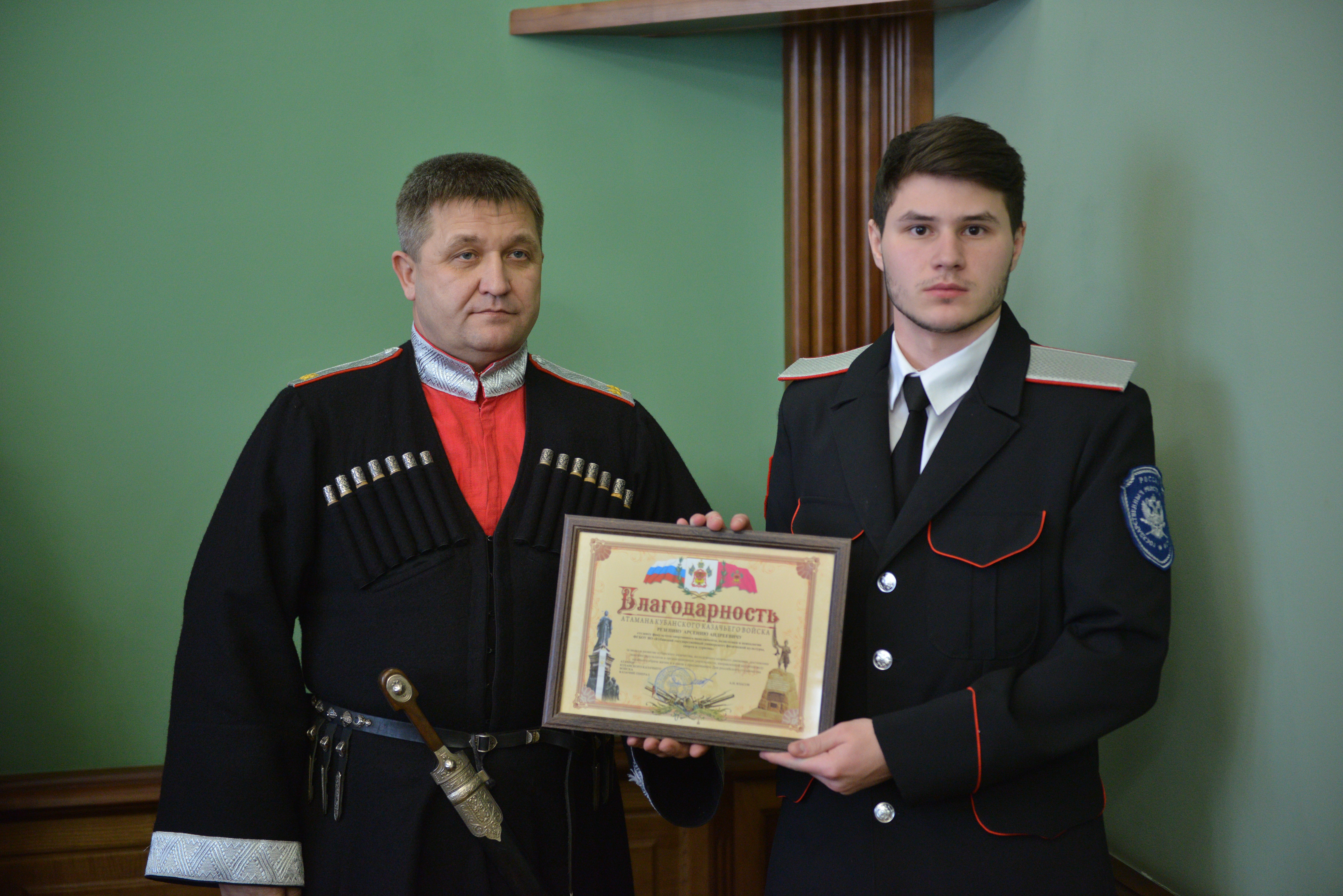 В рамках встречи прошла торжественная церемония награждения. Александр Иванович вручил студентам благодарности атамана Кубанского казачьего войска и сертификат на сумму 100 тысяч рублей.