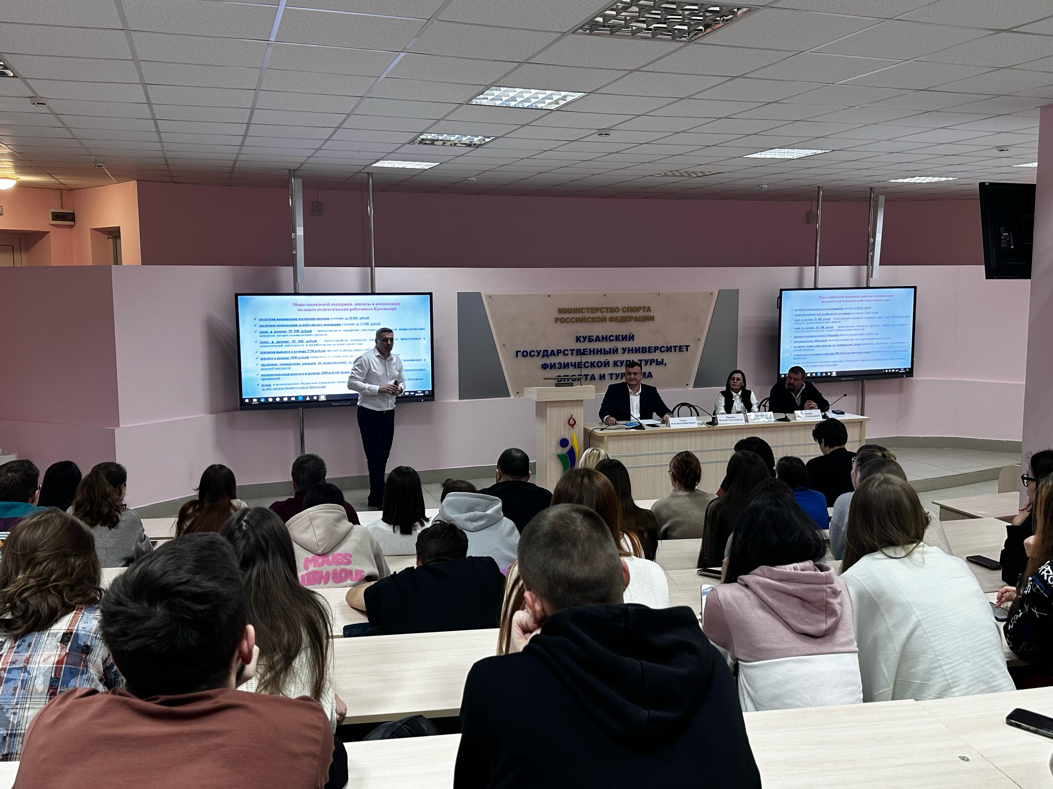 В КГУФКСТ состоялась встреча представителей образования администраций Краснодарского края и муниципального образования город Краснодар с выпускниками вуза в рамках профориентационного мероприятия о перспективах трудоустройства в педагогической сфере.