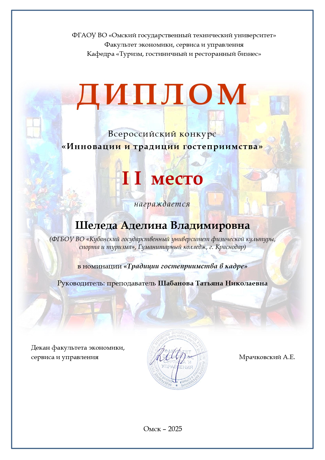 1 апреля 2025 года на базе Омского государственного технического университета были подведены итоги Всероссийского молодежного конкурса «Инновации и традиции гостеприимства», организованного кафедрой туризма, гостиничного и ресторанного бизнеса.