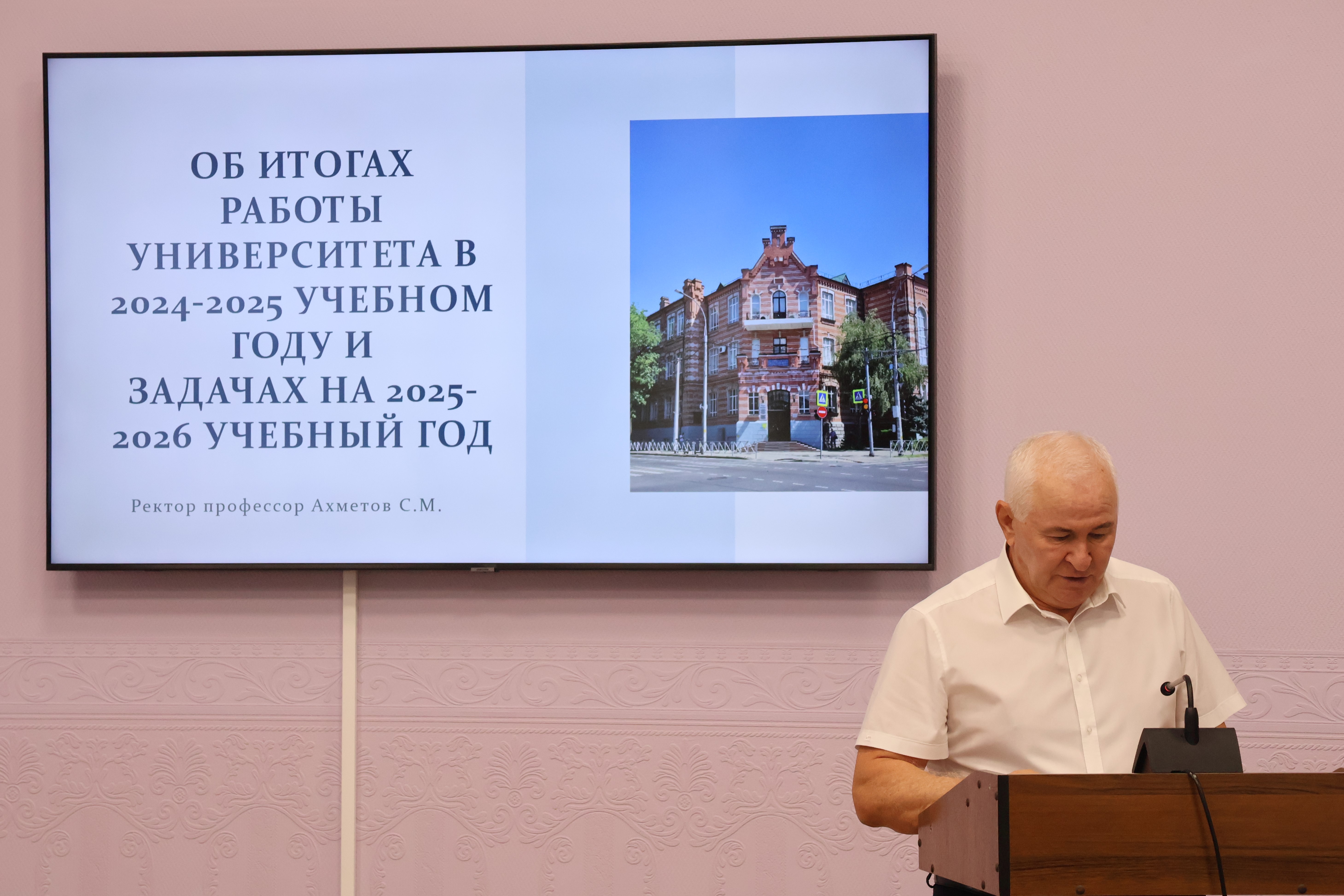 В соответствии с повесткой дня, с основным докладом выступил ректор профессор Султан Меджидович Ахметов, который подвел итоги работы университета в 2024-2025 учебном году и рассказал о задачах и плане работы на 2025-2026 учебный год.