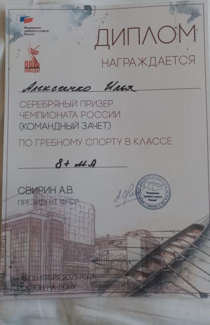 Обучающийся 3 курса колледжа Алексеенко Илья стал серебряным призером Чемпионата (командный зачет) по гребному спорту в классе 8+ма.