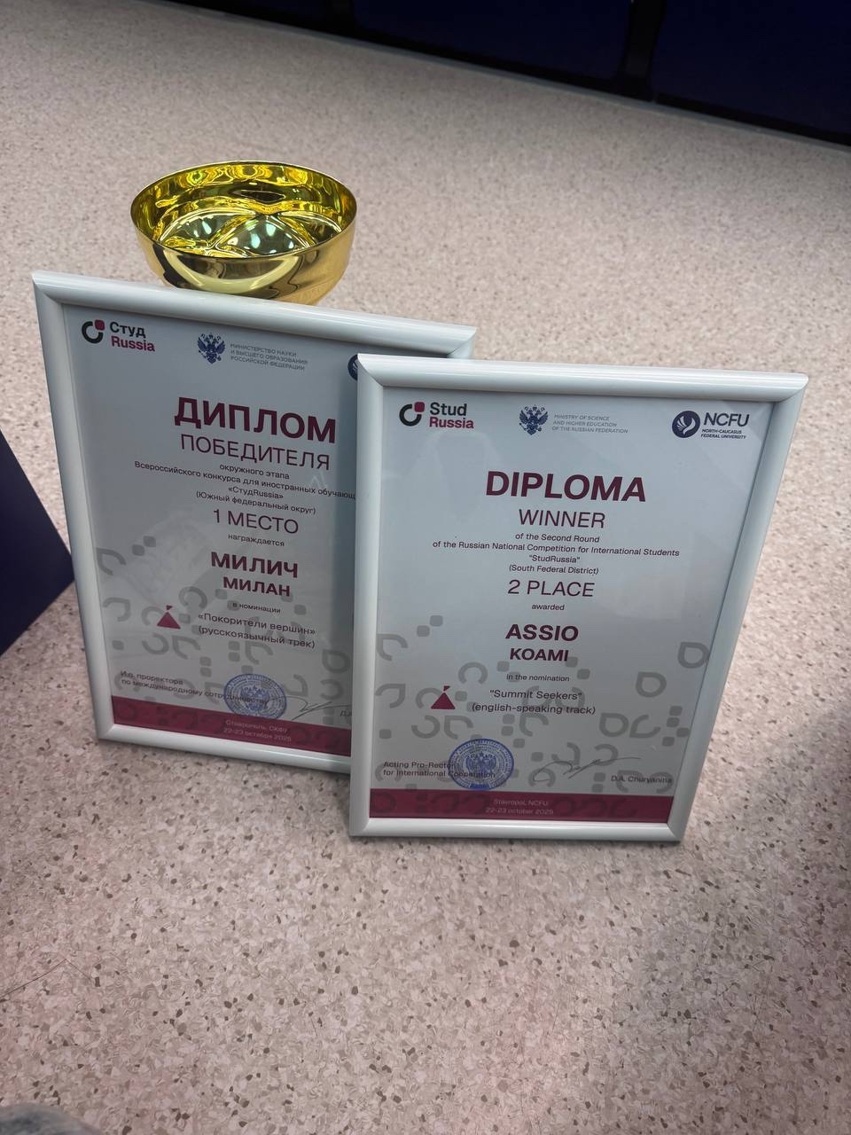 Милич Милан (Сербия) - факультет спорта, 3 курс - победитель в номинации "Покорители вершин" (русскоязычный трек) и Ассио Коами (Гана) - аспирантура, 2 курс - завоевал 2-ое место в номинации "Покорители вершин" (англоязычный трек).