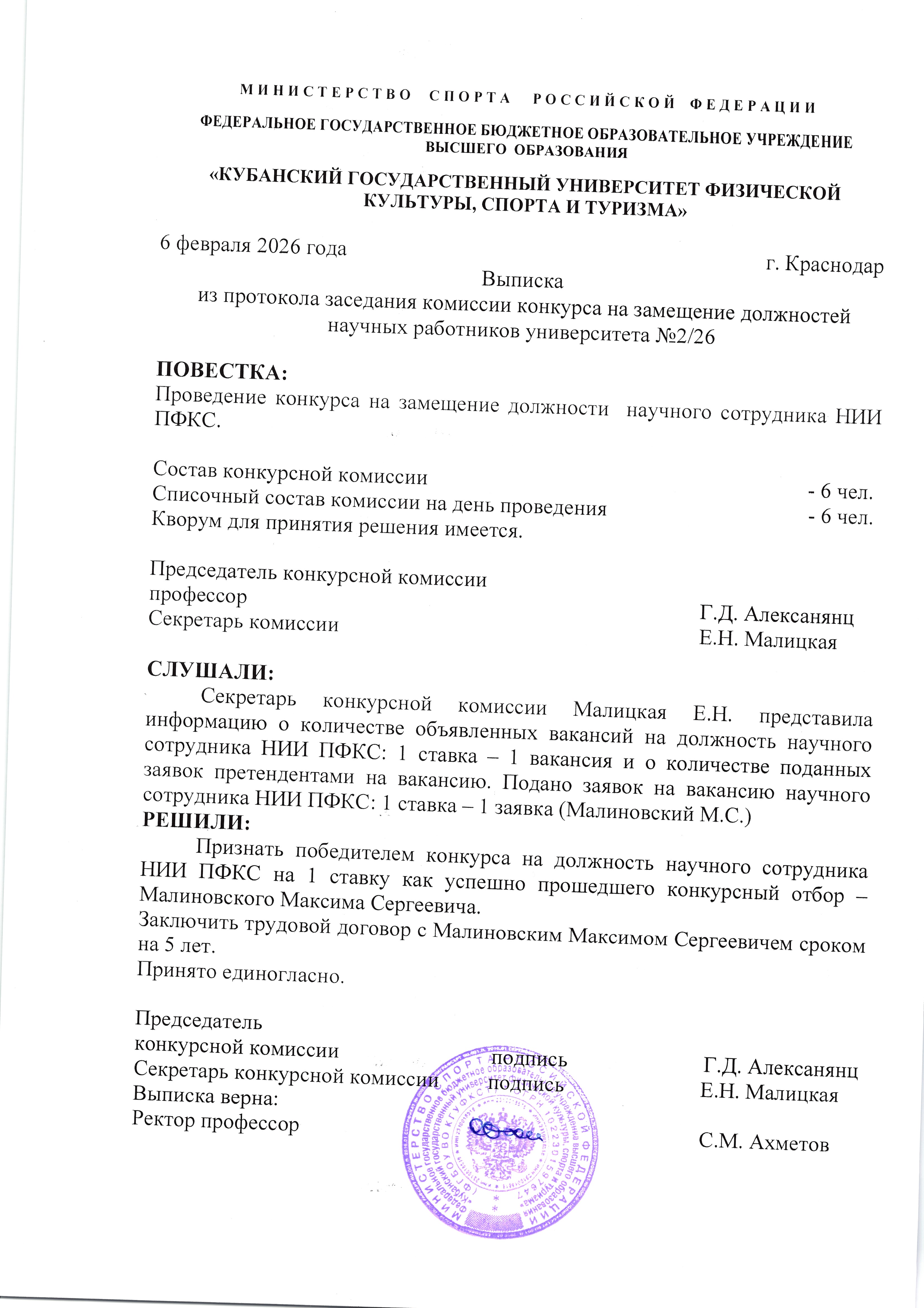 Приказ о создании комиссии для проведения конкурса на замещение должностей научных работников университета ( ФГБОУ ВО КГУФКСТ)