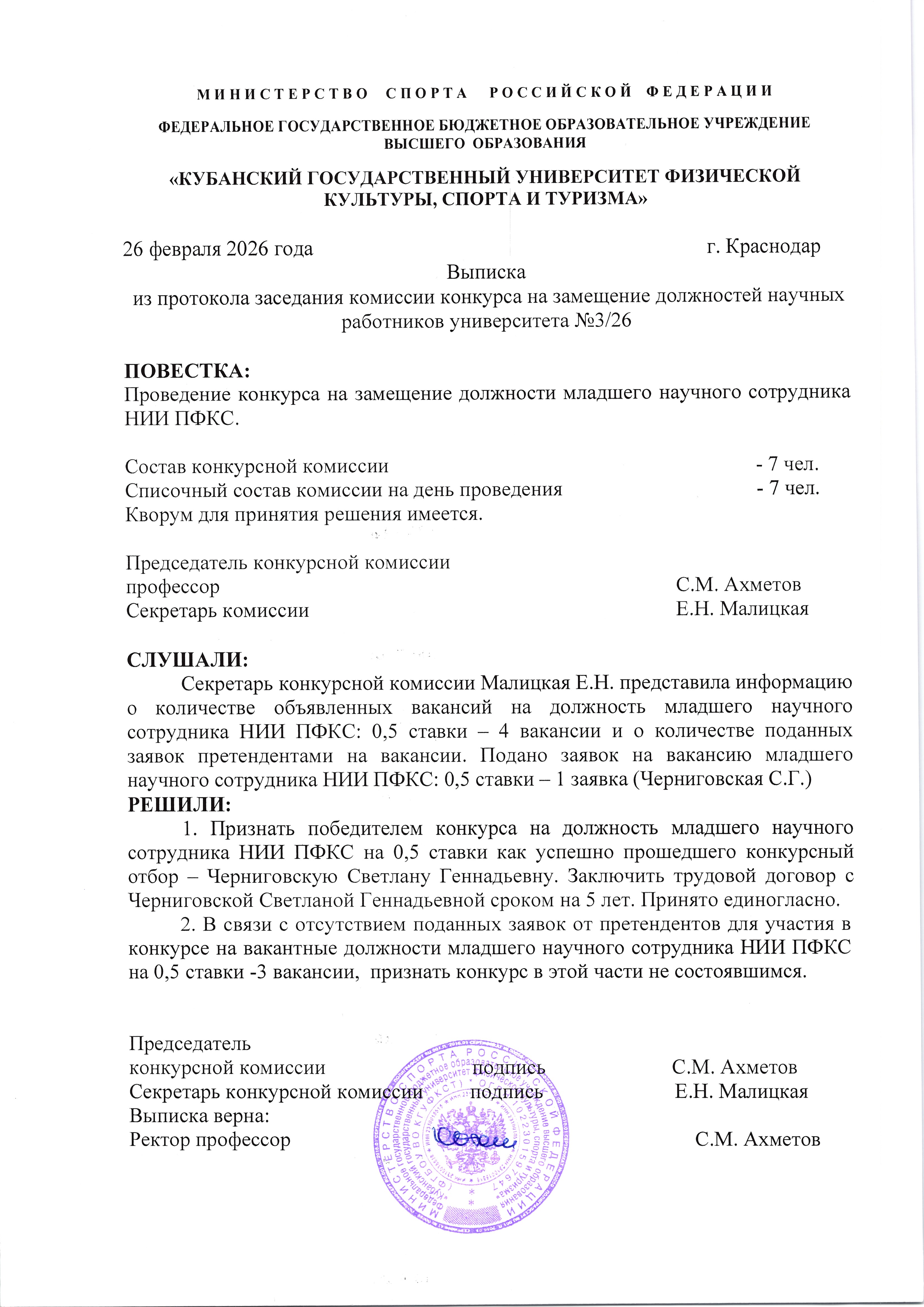 Приказ о создании комиссии для проведения конкурса на замещение должностей научных работников университета ( ФГБОУ ВО КГУФКСТ)