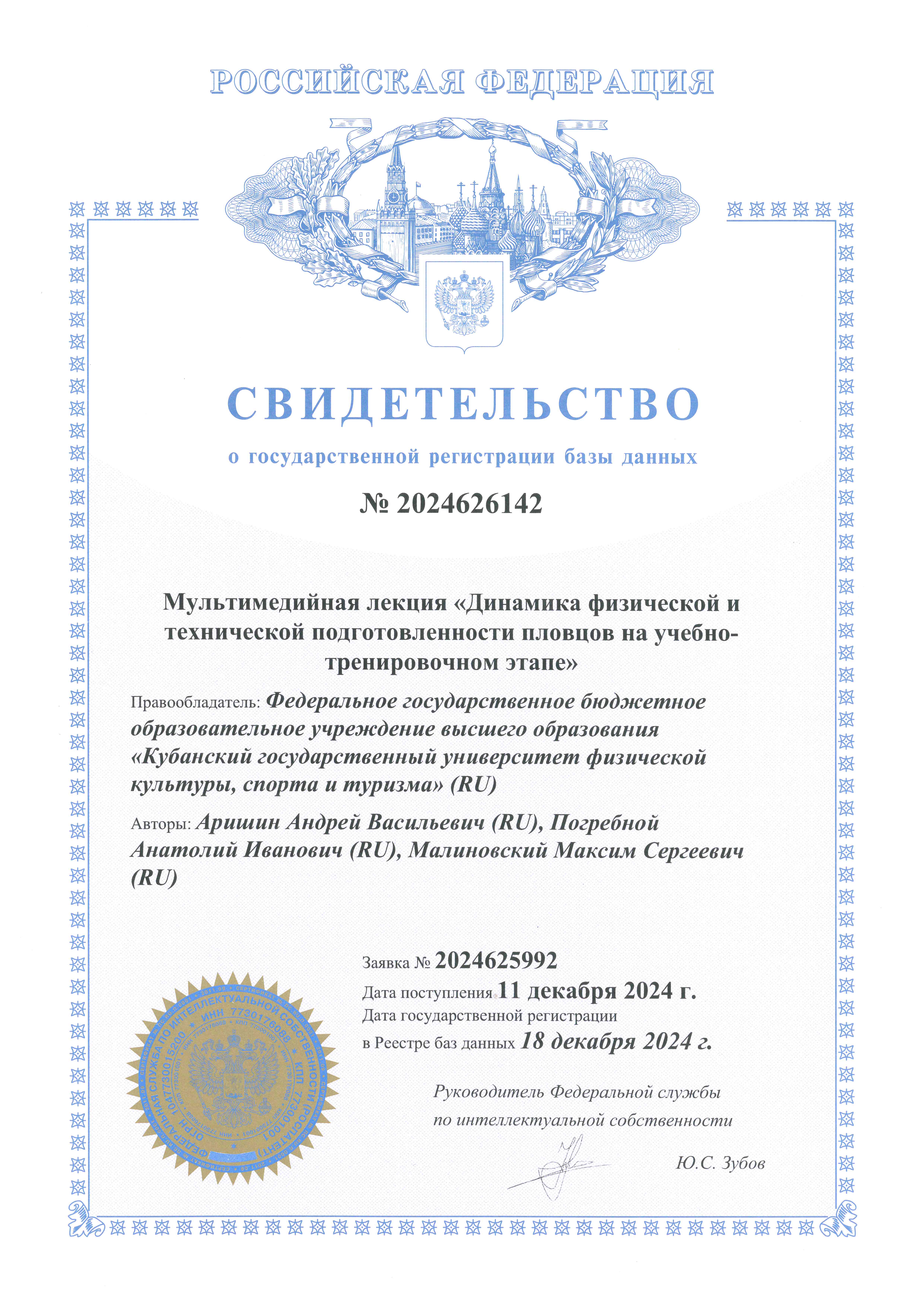 ОТЧЕТ О РАБОТЕ ПО НАУЧНОМУ-МЕТОДИЧЕСКОМУ ОБЕСПЕЧЕНИИ по теме: «МОДЕРНИЗИРОВАННАЯ СИСТЕМА КОМПЛЕКСНОГО КОНТРОЛЯ ПОДГОТОВЛЕННОСТИ ПЛОВЦОВ СПОРТИВНОГО РЕЗЕРВА В ГОДИЧНОМ ЦИКЛЕ» 2024 |