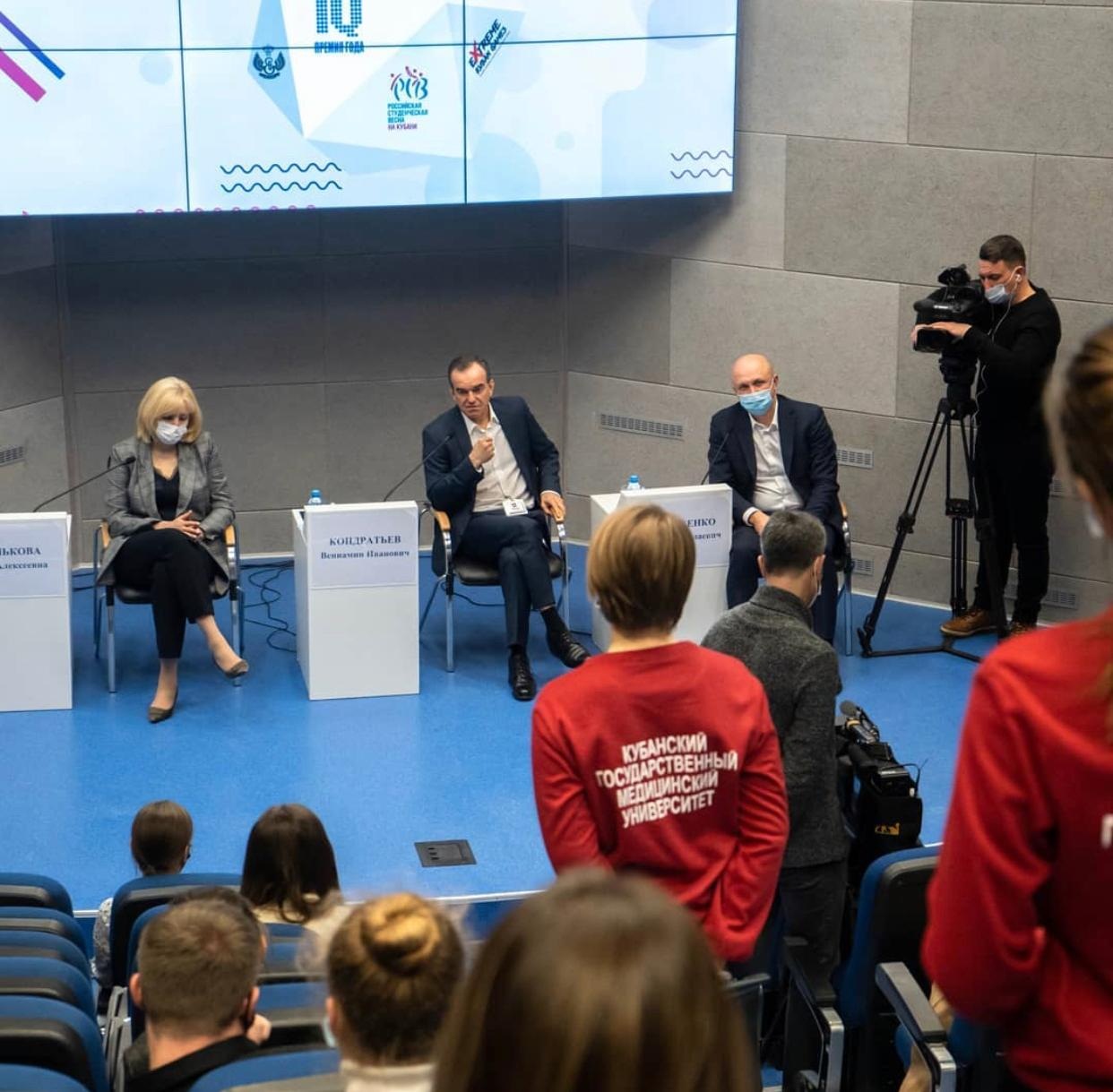 25 января 2021 года, в День российского студенчества, губернатор Кубани Вениамин Иванович Кондратьев поздравил самых активных, талантливых и инициативных студентов Краснодарского края. Встреча состоялась в здании Кубанского государственного медицинского университета. В мероприятии приняли участие вице-губернатор региона Анна Алексеевна Минькова, ректор КубГМУ Сергей Николаевич Алексеенко, представители студенчества Кубани. В их числе студенты и волонтеры нашего университета: